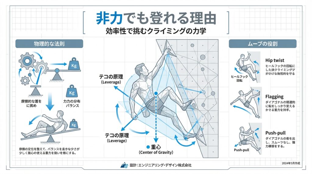 非力な人がスルスル登れる物理的な理由とクライミングムーブの役割
