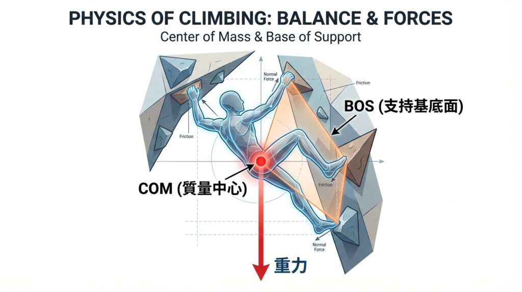 クライミングにおける身体操作の本質は、COM(Center of Mass:質量中心)とBOS(Base of Support:支持基底面)という2つの物理変数の制御に集約されます。