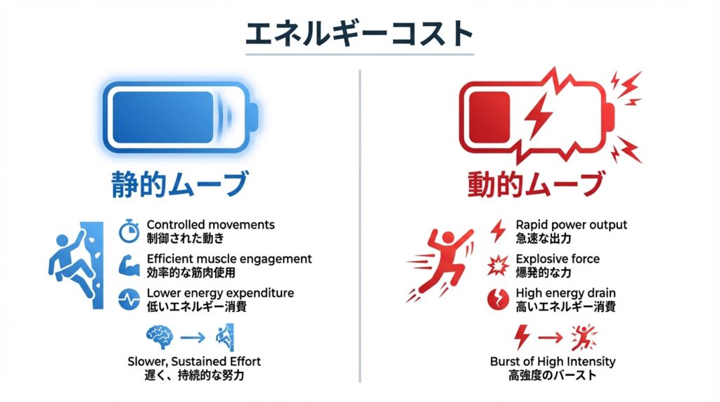 スポーツ科学の研究においても、傾斜壁における登攀では、ダイナミックな動作の方が総エネルギー消費量が有意に低いというデータが示されています。一瞬の爆発的な出力で身体を引き上げる動的ムーブは、ホールドを保持している絶対時間が短いため、トータルでの筋力消耗を最小限に抑えられるからです。