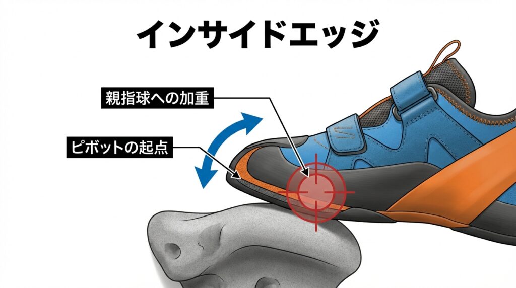 インサイドエッジは、クライミングにおけるフットワークの原点であり、全ムーブの9割で使用すると言っても過言ではない最重要スキルです。具体的には、シューズの親指側先端(インサイド)のみをホールドに乗せ、親指の付け根である「母指球」一点に全体重を預ける立ち方を指します。