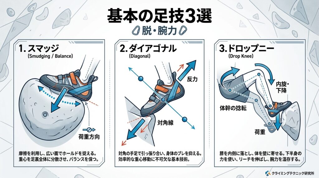 本セクションでは、クライミングシューズの機能を最大限に引き出し、物理的に理にかなったフットワークについて解説します。