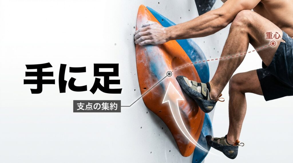 多くの初心者が陥る「動けない」という現象は、無意識のうちにCOMをBOSの垂直線上に留め続けようとする本能的な防衛反応が原因です。物理学において、COMがBOSの内側に収まっている状態は「安定」を意味します。しかし、クライミングにおいて「登る」という行為は、現在地からより高い位置への「移動」であり、移動を開始するためには、あえてこの安定状態を崩さなければなりません。