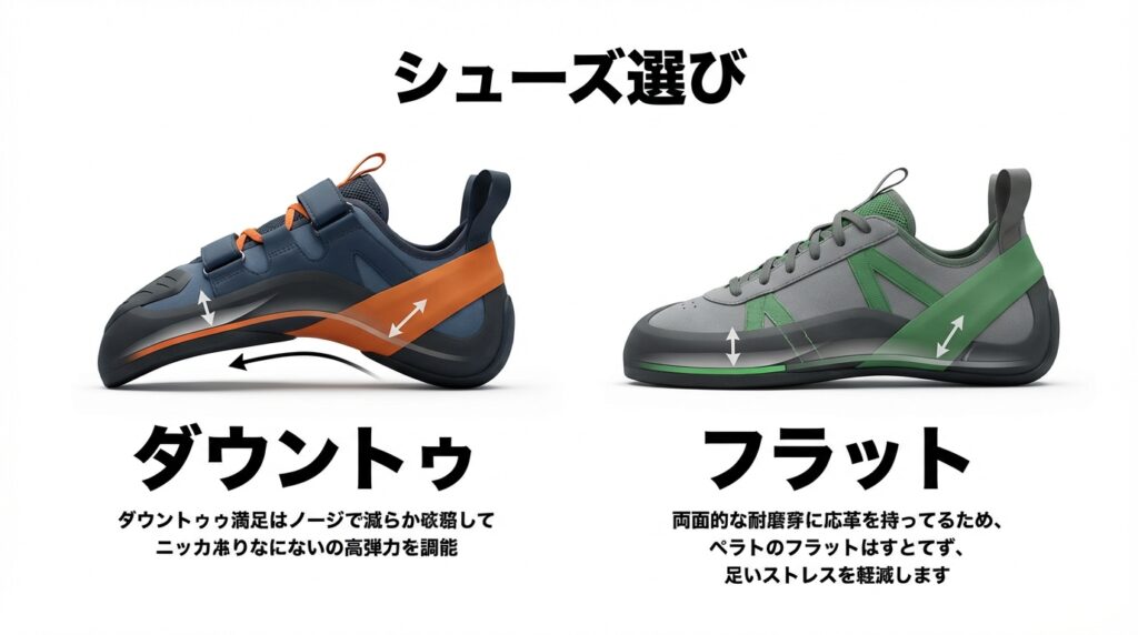 両者は摩擦を得るためのアプローチが、力学的に真逆だからです。ダウントゥは爪先を鉤爪のように湾曲させることで、点に対して強い圧力を集中させ、ホールドを「掴む」動作を補助する役割を持ちます。対してフラットは、ソールを平らに保つことで接地面積を最大化し、面での摩擦力を確保する設計と言えます。