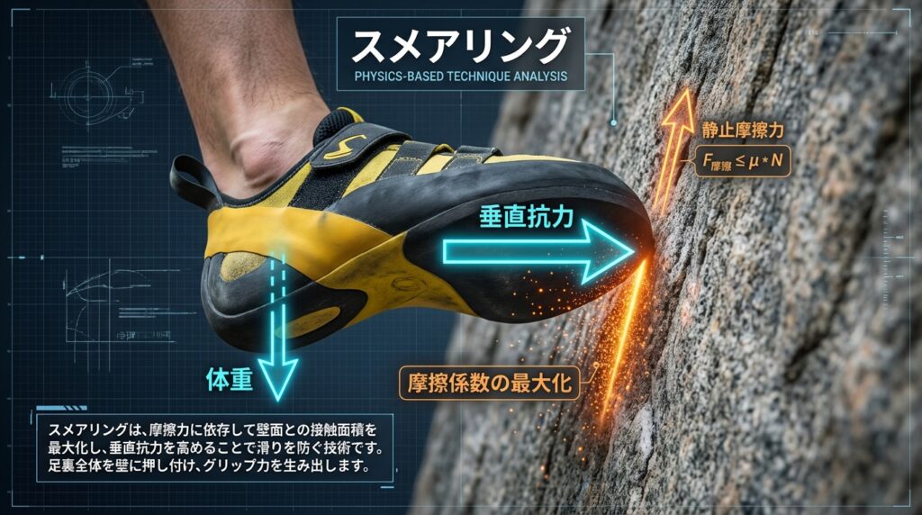 スメアリングは、明確なフットホールド(足場)が存在しない壁面に対し、クライミングシューズの摩擦力(フリクション)だけを頼りに立つ技術です。突起にエッジを引っ掛けるこれまでの足技とは異なり、ゴムのグリップ性能と物理法則を最大限に利用して身体を支えます。
