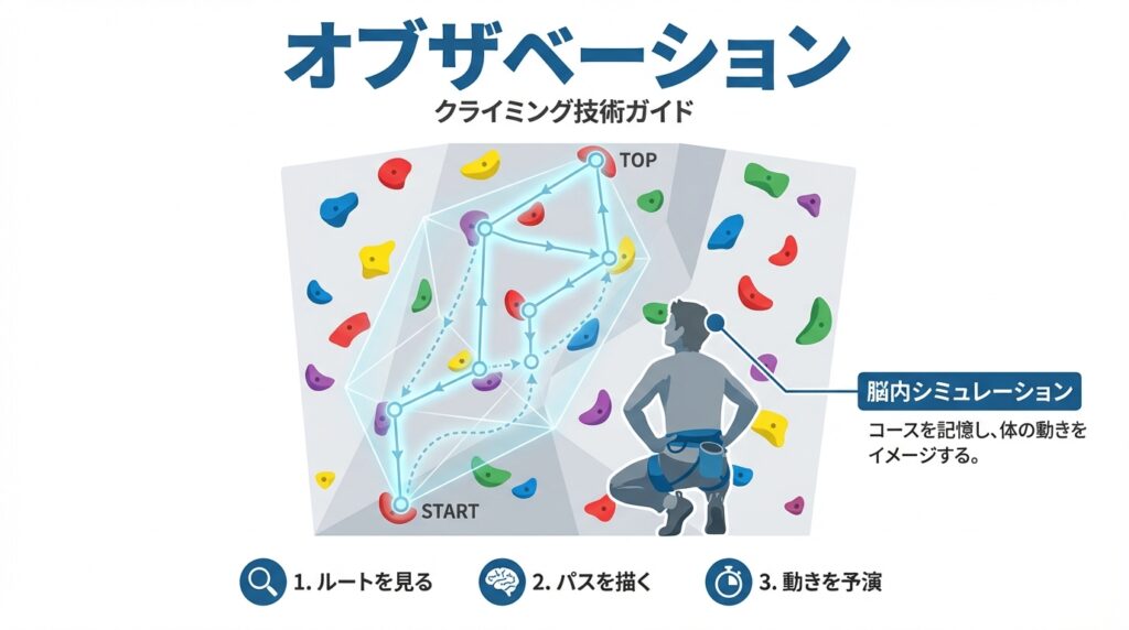 オブザベーションとは、単にホールドの位置を目で追うことではありません。スタートからゴールまでのすべての動作シークエンスを、自分の身体感覚と照らし合わせて脳内にプログラミングする高度なシミュレーション作業です。多くの初中級者が壁に取り付いてから「次は右手か、左手か」と迷いますが、これでは重力によって体力が削られ続け、思考と筋肉の両方が酸欠状態に陥ってしまいます。