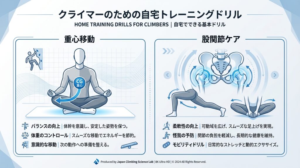 ジムに行けない日こそ、自宅の床でクライミングの「操作OS」をアップデートする絶好の機会です。壁がない環境で重心移動の感覚を養うことは、脳内イメージと実際の身体操作のズレを修正するのに極めて有効でしょう。