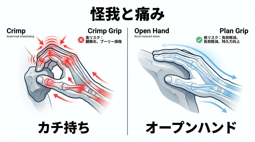 指の故障を防ぎ、長く登り続けるためには、ホールドの形状やムーブの強度に応じて「カチ持ち(クリンプ)」と「オープンハンド」を戦略的に使い分ける必要があります。なぜなら、バイオメカニクスの観点において、それぞれの握り方が指の滑車組織である「プーリー」にかける物理的負荷が大きく異なるからです。特に脱初心者の時期は、保持力の向上に伴って指への負担が急増するため、この判断ミスが長期離脱につながりかねません。