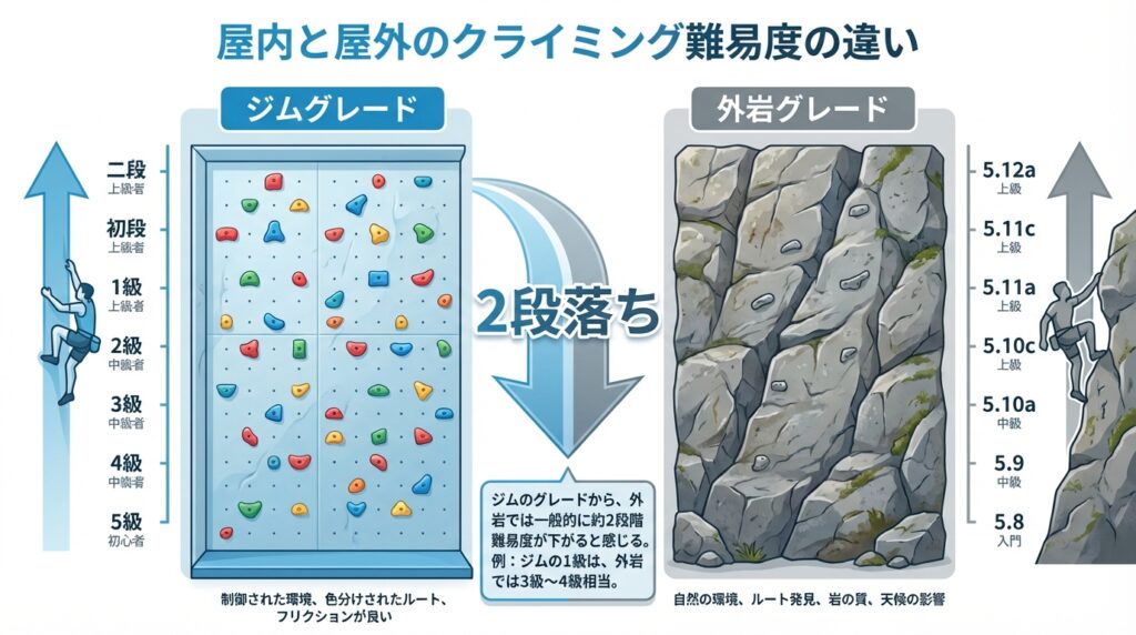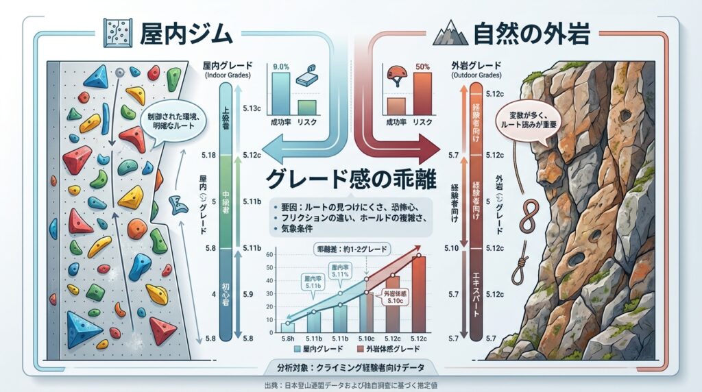 その背景には、明確な統計的傾向が存在します。海外のクライミングデータ分析サイトの調査などによれば、インドアでのグレードから平均して2段階ほど下げた数値が、外岩での実績値と相関することが示唆されました。商業ジムは顧客に達成感を味わってもらうため、どうしてもグレード設定が甘くなる「インフレ傾向」にあることは否めません。