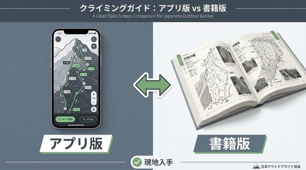 一方で、スマートフォンのアプリや電子書籍は、荷物を軽量化できる点が最大のメリットです。GPS機能と連動して現在地を確認できるサービスもありますが、山間部では電波が入らないエリアも多く存在します。情報の更新頻度はデジタルが有利なものの、国内のローカルな岩場に関してはデータが登録されていないケースも珍しくありません。基本的には書籍版をメインに据え、デジタル版はあくまで補助ツールとして運用するのが確実なリスクヘッジになります。