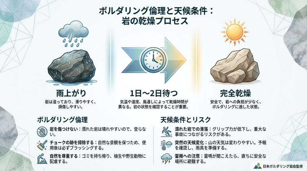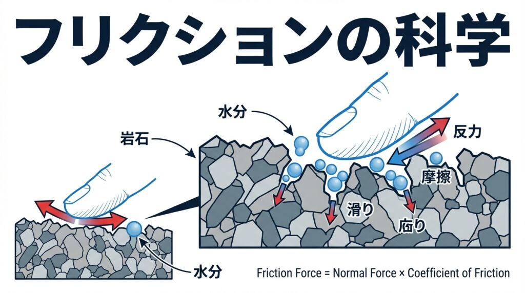 特に砂岩(さがん)などの堆積岩は、吸水すると脆くなる性質があり、体重をかけた瞬間に重要なホールド(突起)が欠損してしまう事例が後を絶ちません。