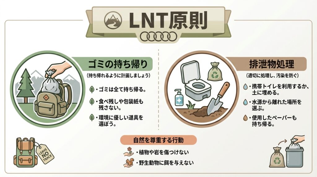 食事のゴミや行動食の匂いは動物を強力に誘引するため、密閉袋に入れて管理を徹底しましょう。