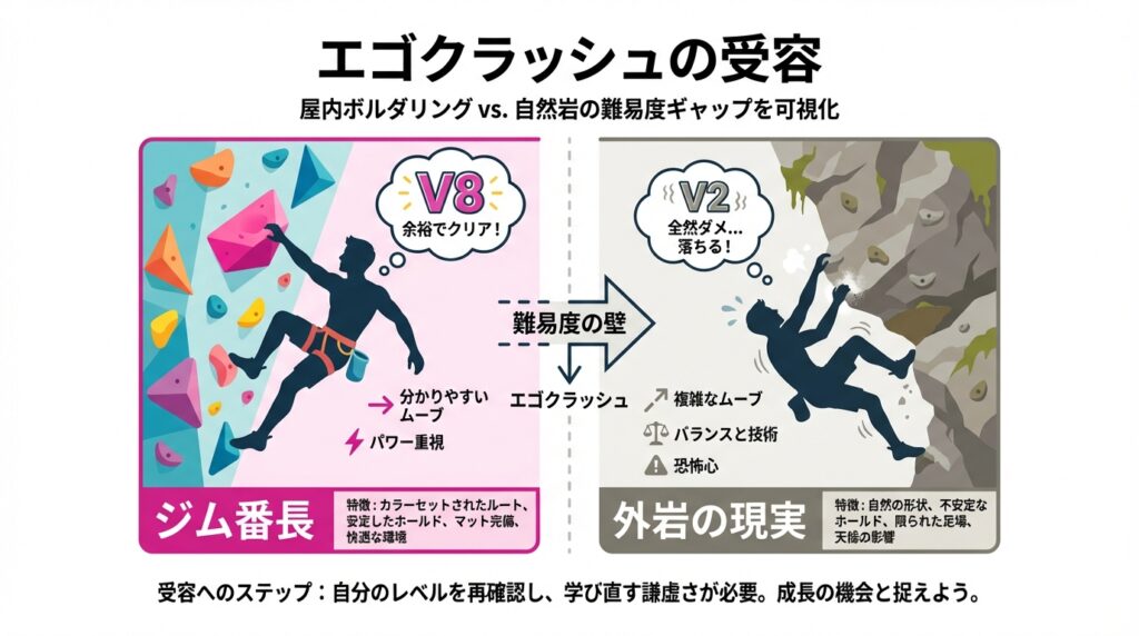 インドアジムで上級者として認知されているクライマーほど、初めての岩場で「全く通用しない」現実に直面し、激しい自尊心の崩壊(エゴクラッシュ)を経験します。