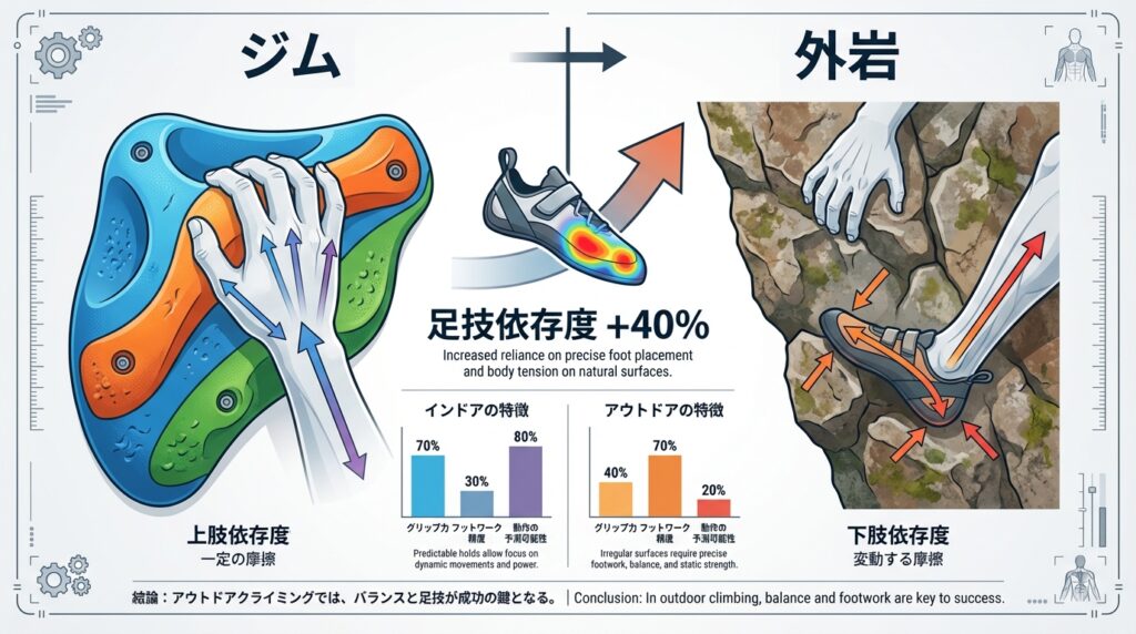 外岩におけるクライミングパフォーマンスを決定づける要因として、足技(フットワーク)への依存度がインドアジムと比較して約40%高いという分析データが存在します。
