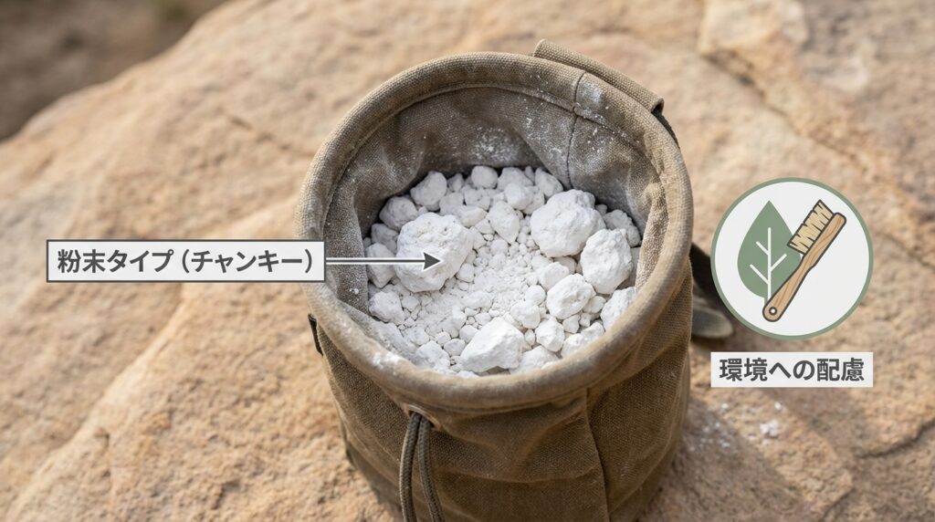 推奨されるのは、ブロック状の塊が混ざった「チャンキータイプ」と呼ばれる純粋な炭酸マグネシウムです。適度な塊を指先で押し潰しながら塗布することで、岩質や湿度に合わせて付き具合を物理的に微調整できる利点があります。風で飛散しにくいという点でも、周囲の環境への負荷を最小限に抑えられるでしょう。
