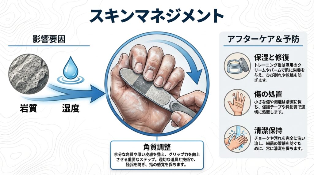 ただし、その恩恵を受けるには代償も必要です。鋭い結晶はヤスリのように皮膚を削るため、指皮の管理(スキンマネジメント)が完登の鍵を握ることになるでしょう。