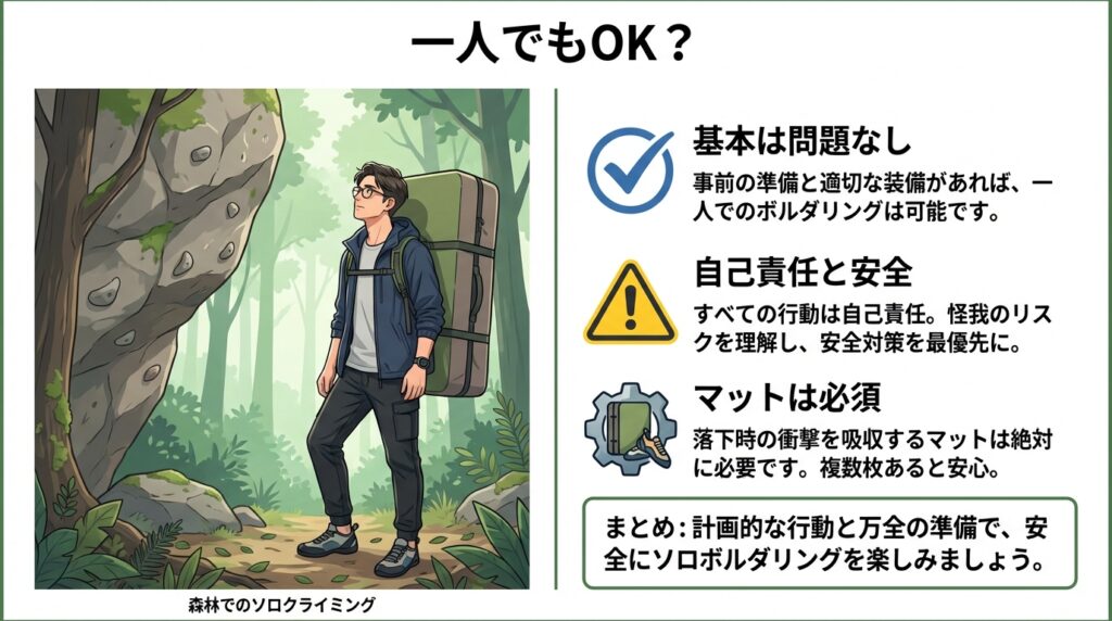 結論から言えば、一人で外岩へ行くこと自体に全く問題はありません。実際に、自分のペースで岩と対話できる没入感を求めて、ソロで活動するクライマーは数多く存在します。