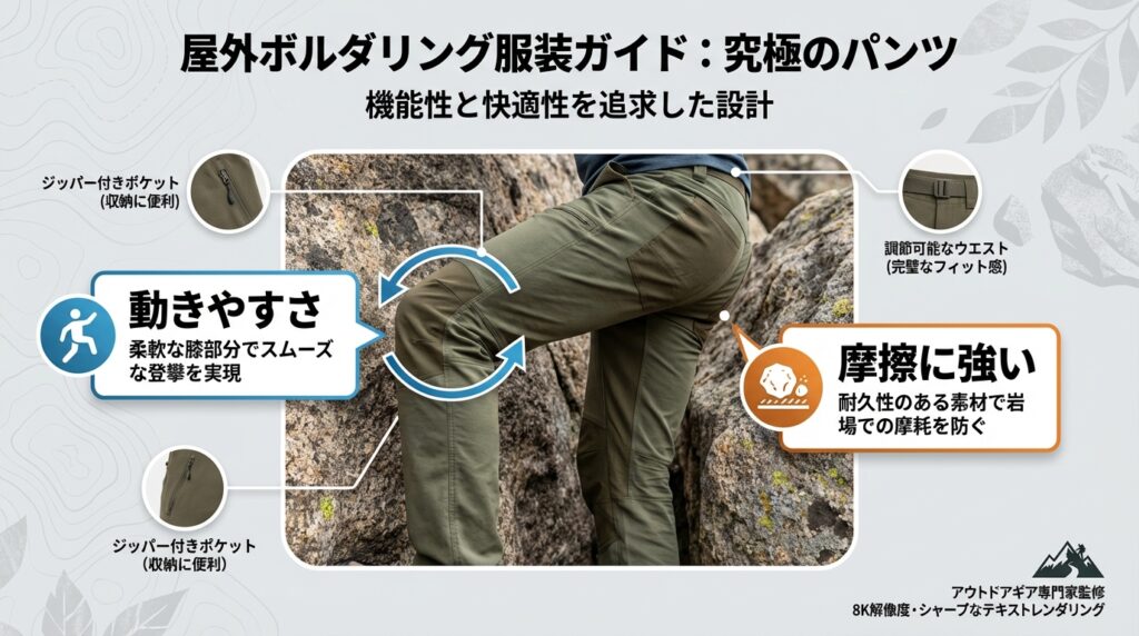 外岩におけるウェア選びでは、可動域の広さ以上に、岩肌の摩擦に負けない「素材の耐久性」を最優先に考える必要があります。インドアジムのように整った環境でプラスチックを登るのとは異なり、自然の岩場は巨大な紙ヤスリの上で運動するようなものだと認識してください。