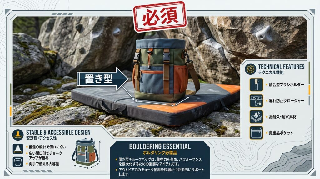 外岩でのボルダリングでは、腰に巻くタイプではなく、地面に設置する「置き型」のチョークバッグを必ず用意してください。最大の理由は、落下時における脊椎への深刻なダメージを防ぐという安全管理の側面にあります。