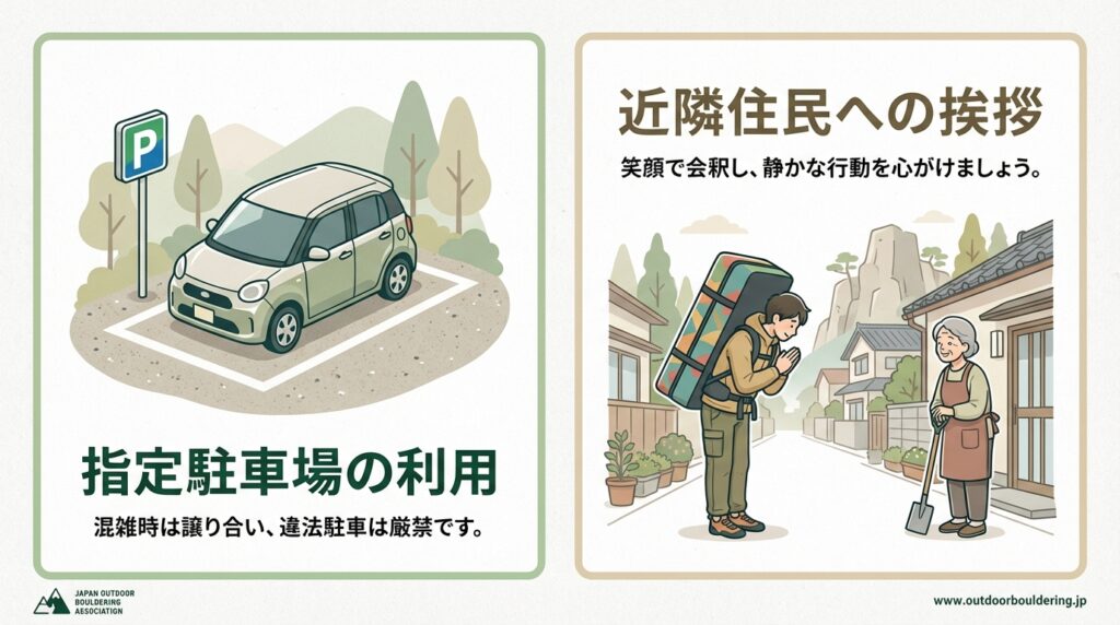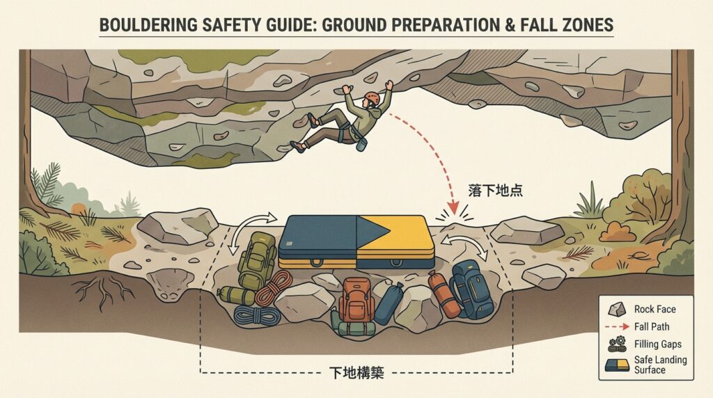現地で同じ岩を登っているグループがいれば、「挨拶をしてマットを混ぜてもらう」という方法も有効な安全対策の一つと言えます。互いにスポットし合うことでリスクを分散でき、ローカルの情報を教えてもらえる機会にもなるでしょう。