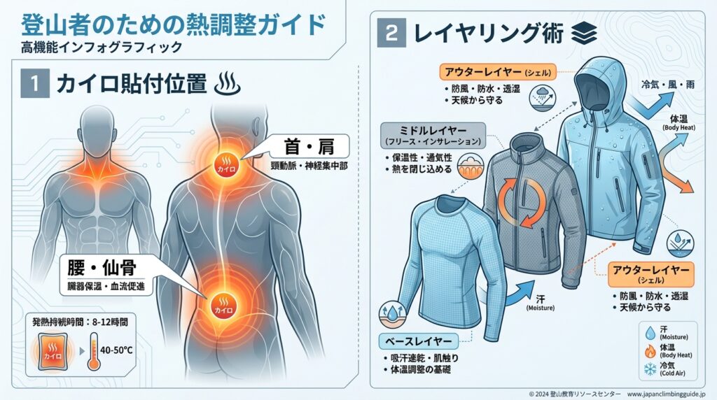 気温5度を下回る日陰の環境下で、登攀直後にかいた汗を放置すれば、気化熱により急速に体温が奪われ筋肉が硬直してしまうでしょう。身体が冷え切った状態では、次のトライで思うように身体が動かず、肉離れなどの怪我のリスクを高めることにも繋がりかねません。待機時間は「寒さを我慢する時間」ではなく、次のトライに向けた「回復の時間」と捉えるべきです。