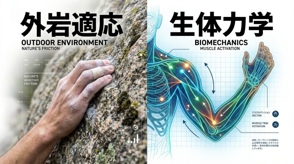 実際のフィールドでは、岩の表面にある数ミリ単位の結晶や、わずかな窪みを自ら見つけ出し、そこに全体重を預ける技術が求められます。ムーブ解析に基づく生体力学の視点では、インドア課題の多くが上半身の牽引力(引きつける力)で解決可能なのに対し、外岩では下半身による加重分散ができない限り、指先にかかる負荷が物理的限界を超えてしまうケースが多発すると指摘されています。