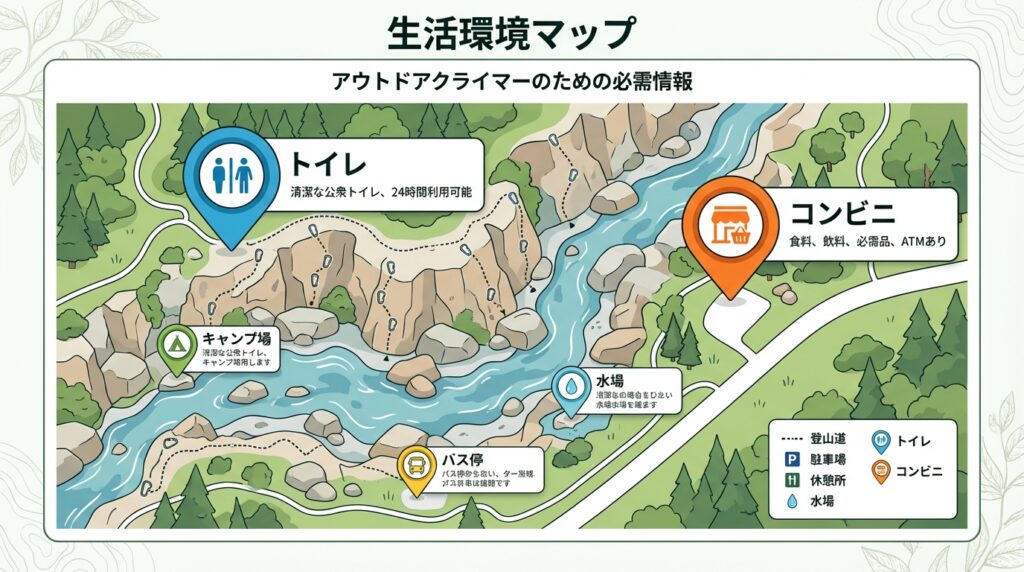 自然の中での活動において、生理的な欲求や安全確保に関わるインフラが不十分であると、クライミングへの集中力は著しく削がれます。特に女性の同行者がいる場合や、慣れない初心者を連れていく際は、これらの環境要因が1日の満足度を決定づけると言っても過言ではありません。