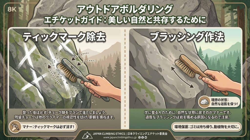 美しい課題を後世に残すためにも、岩質に優しい道具を選び、登攀後は必ず来た時よりも綺麗にして帰るのが最低限のマナーです。適切なブラシ選びは、自分のパフォーマンスを高めるだけでなく、自然に対する敬意を示す第一歩と言えるでしょう。