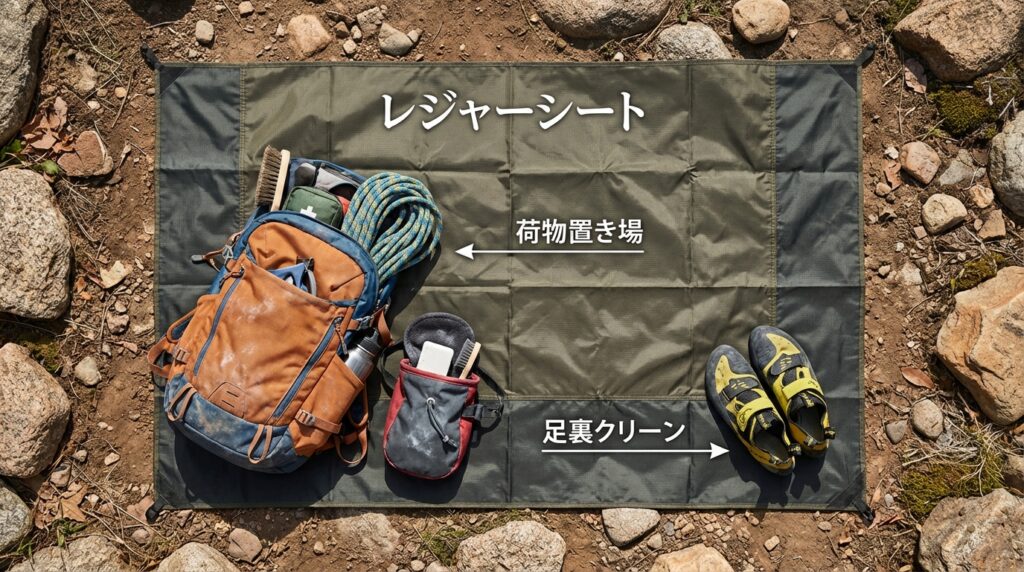 レジャーシートは、単なる荷物置き場としてだけでなく、クライミングのパフォーマンスを最大化するための「衛生的なベースキャンプ」として機能します。