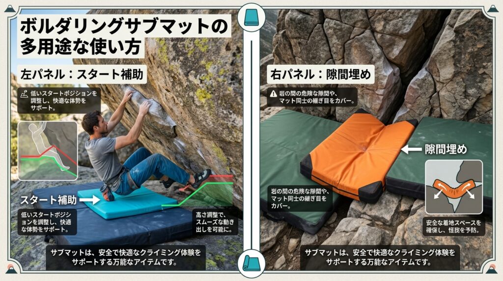 メインのクラッシュパッドに加えて、薄手で小型のサブマットを用意すると、安全管理のレベルが格段に向上します。