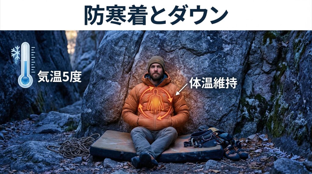 具体的に推奨されるのは、クライミングウェアの上からそのまま羽織れる、大きめサイズの厚手ダウンです。街中で着るような薄手のインナーダウンではなく、雪山登山でも通用するレベルの保温力を持ったアウターを用意してください。「登る時は脱ぎ、降りたら即座に着る」というサイクルを徹底することが、極寒の岩場で成果を出すための鉄則です。