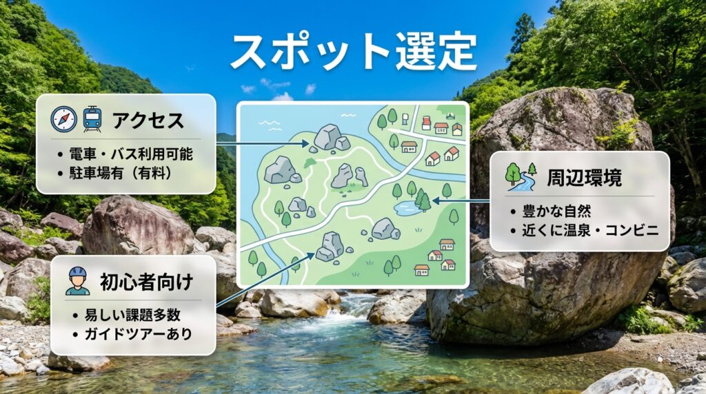 アクセスに関しては、みずがき山自然公園(植樹祭広場)などの駐車場を拠点としますが、岩場までのアプローチ(移動)は本格的な登山道に近い場所も少なくありません。