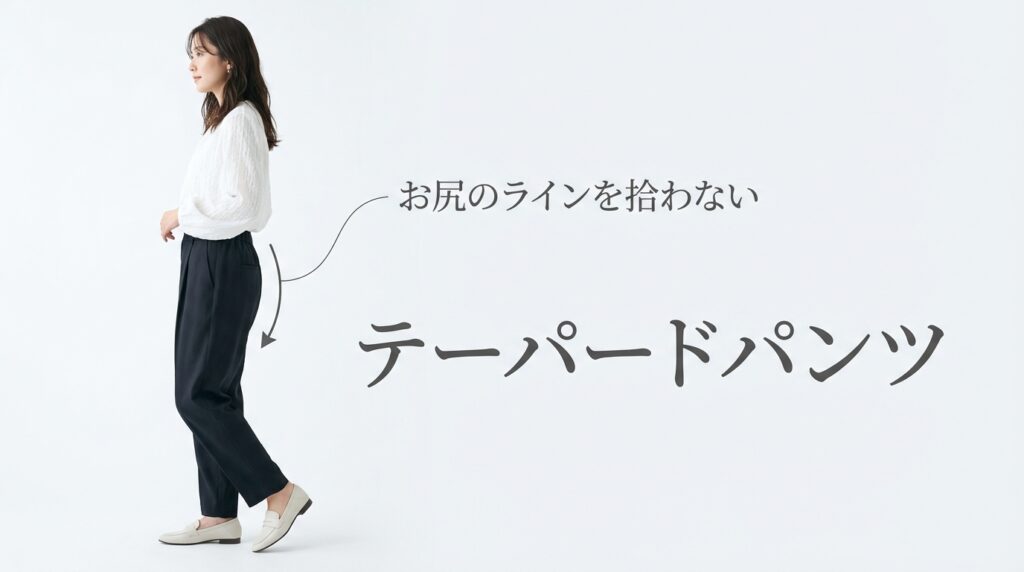 ピチピチとしたレギンスに抵抗がある方や、ジムの更衣室を利用せずにそのまま帰りたい方には、テーパードパンツが最も適しています。腰回りや太ももにはゆとりがありながら、足首に向かって細くなるシルエットが特徴で、気になる下半身のラインを自然にカバーできる点が魅力です。