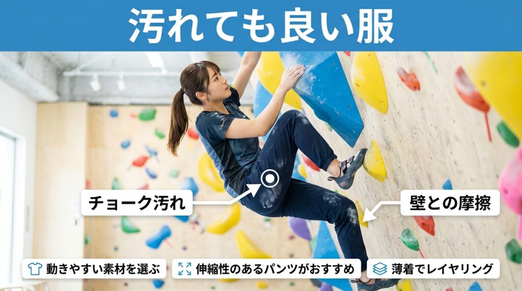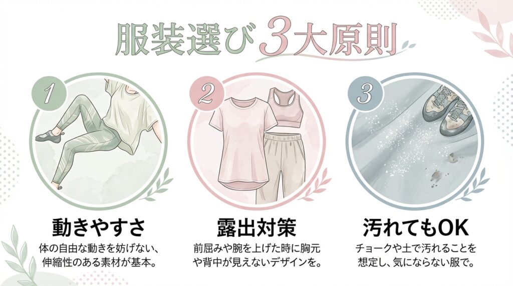 伸縮性のある動きやすいパンツや、前かがみになっても胸元が見えないトップスを選べば、初心者でも気兼ねなく壁に挑めるでしょう。