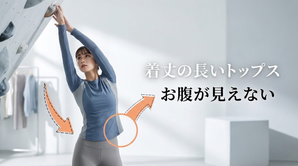 ボルダリングにおいてトップス選びで最も重視すべき機能は、腕を限界まで上げた状態でも裾がめくれ上がらない「十分な着丈」です。