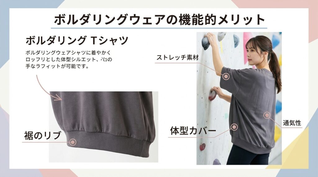このアイテムを選ぶ最大のメリットは、手を高く上げた際の露出対策とおしゃれを両立できる点にあります。一般的なTシャツでは、高い位置にあるホールドを掴もうと腕を伸ばした瞬間に裾が持ち上がり、腰回りや下着が無防備に見えてしまうことが少なくありません。対してこのデザインの多くは、着丈が長めに設定されていたり、インナーとの重ね着(レイヤード)を前提としていたりするため、激しい動きの中でも肌の露出を自然にカバーできます。