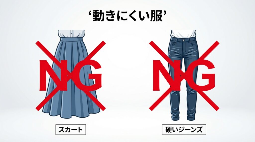 硬いデニム生地や伸びないチノパンも同様に不適切であり、膝や股関節の可動域を物理的にロックしてしまう点が問題です。