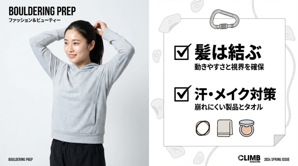 メイクに関しては、ボルダリングが全身を使うハードな運動であることを考慮し、汗で崩れることを前提とした対策を講じましょう。