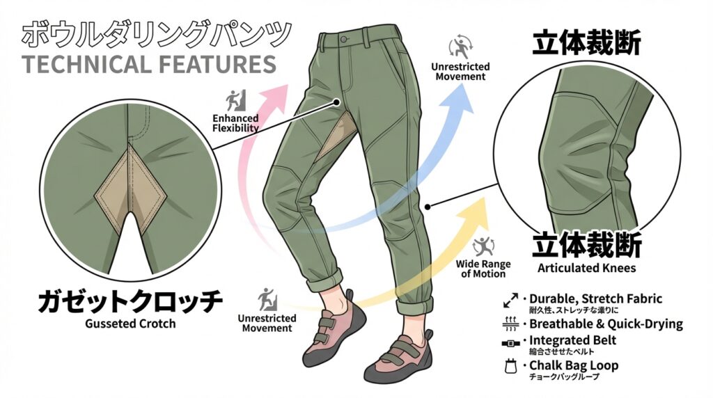 足の動かしやすさを決める決定的な要素は、実は生地のストレッチ性よりも「縫製の構造」にあります。本格的なクライミングパンツには、ほぼ例外なく「ガゼットクロッチ」と「立体裁断」という技術が採用されていました。