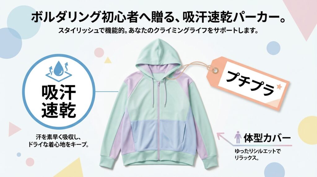 ボルダリングジムでは、運動量による発汗と待機時間の体温低下が交互に訪れるため、体温調節がしやすい薄手のパーカーを一枚持参することをおすすめします。特にユニクロやGUなどのプチプラブランドで展開されている、吸汗速乾機能付きのドライパーカーはコストパフォーマンスに優れた最適解と言えます。