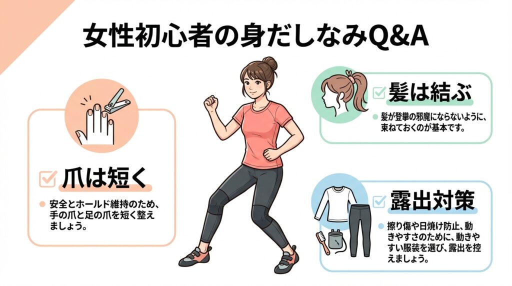 快適かつ安全に壁を登るためには、ウェア以外の身だしなみや環境への対策も欠かせません。