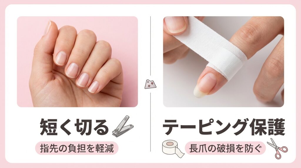 どうしても仕事やファッションの都合でネイルをオフできない場合は、専用のテーピングテープを使用して指先を保護してください。