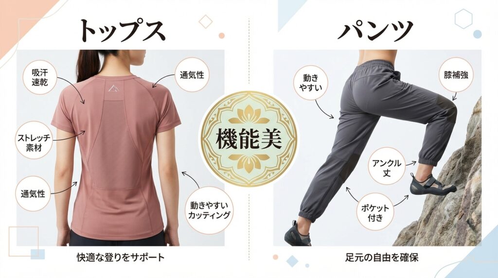 安全で快適に登るためには、単なるスポーツウェアではなく、クライミング特有の動きに対応した「構造」を持つ服を選ぶ視点が欠かせません。