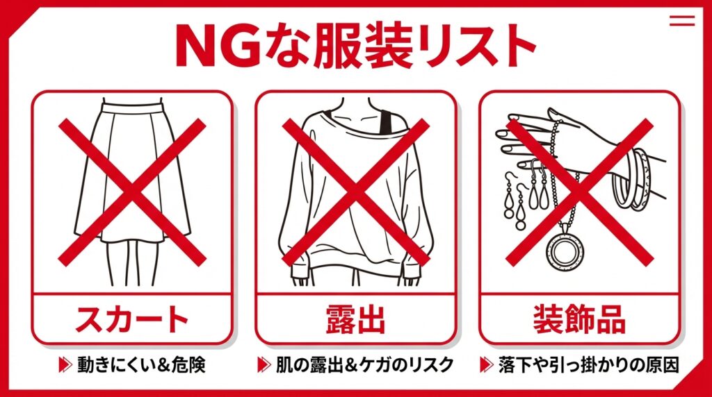 機能性やデザインに優れた専用ウェアを揃えるのも素敵ですが、その前に「これだけは避けるべき」というNGリストを確認しておきましょう。ここでは、単に動きにくいだけでなく、マナー違反や予期せぬ大怪我の原因にもなり得る危険な服装について解説します。