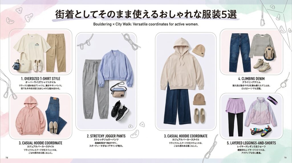 最近では「Street-to-Crag(街から岩場へ)」という概念が浸透し、タウンユースとしても違和感のないおしゃれなクライミングウェアが増えています。着替えの手間を省き、そのまま街へ出かけられるスタイルには、主に以下の特徴があります。
