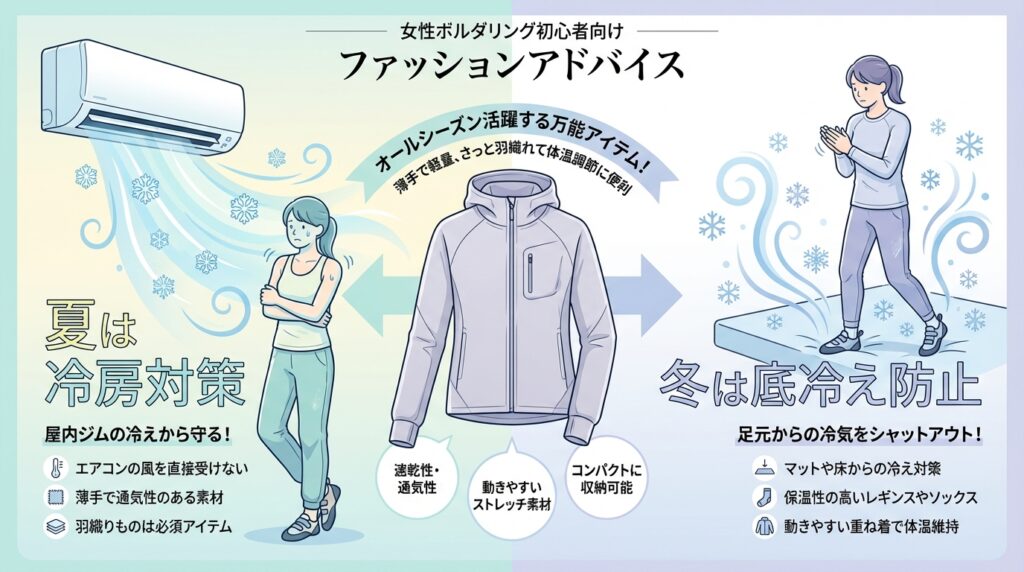 夏場の冷房対策から冬場の底冷え防止まで、季節を問わず活躍するでしょう。専用の高級なウェアを最初から揃える必要はありませんので、まずは手軽な価格で機能的な一枚をバッグに忍ばせておくのが賢明です。