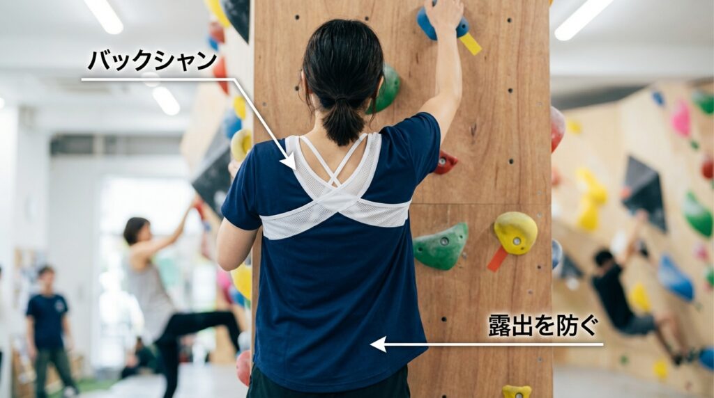 壁を登る際は常に高いホールドへ手を伸ばし続けるため、一般的なファッション用のTシャツでは裾が数センチから十数センチも持ち上がり、無防備な背中やお腹が露出してしまいかねません。特に初心者は壁に張り付くような姿勢になりがちで、ウェアが擦れてさらに捲れやすくなる傾向があります。