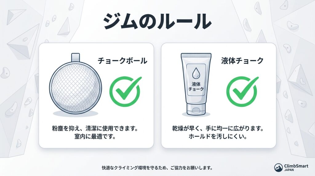 さらに厳格な基準として、「完全液体チョーク限定」としているジムも少なくありません。ここでは粉末タイプの持ち込み自体がマナー違反となるため、速乾性の高いリキッドタイプを一本持っておくと安心でしょう。遠征などで初めて訪れるジムへ行く際は、事前にウェブサイトでルールを確認するか、電話で問い合わせるのが確実な方法です。