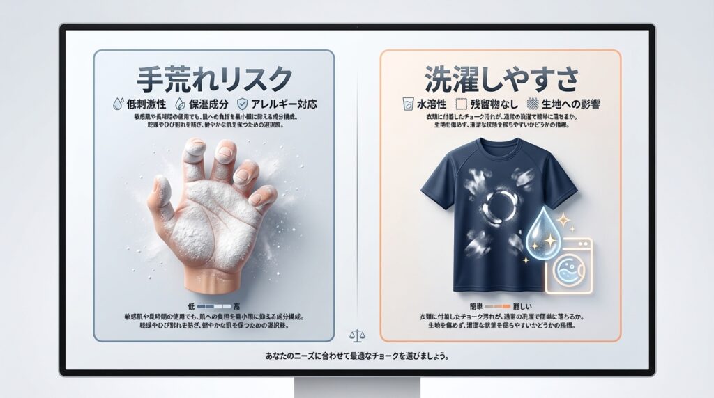 長くボルダリングを続けるためには、グリップ力と同じくらい「肌への負担」と「メンテナンス性」を考慮する必要があります。強力な制動力を誇るチョークには、副作用として手荒れやウェアの汚れを招く成分が含まれている場合が多いからです。