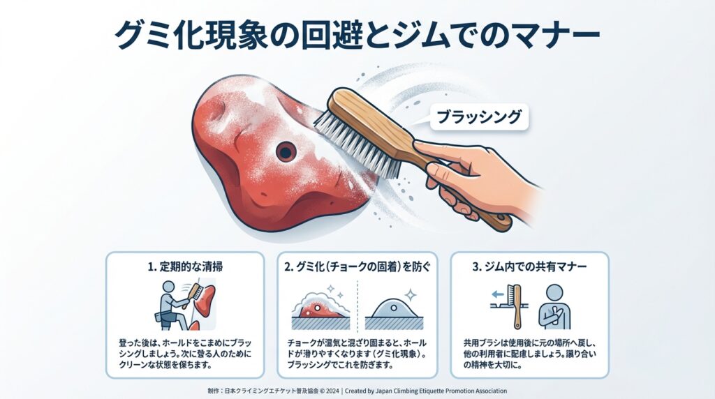 ホールドに付着した過剰な粉は、次に登る人にとって滑りやすい障害物となり、湿気を吸って固まると簡単には取れません。