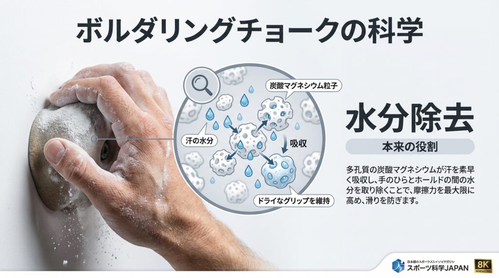 ボルダリングで使用するチョークの最大の役割は、ホールド(壁の突起)への摩擦力を直接生むことではなく、手汗という「水分を除去すること」です。多くの初心者が強力な滑り止めと誤解しがちですが、実際には手の表面をドライに保つための吸水剤として機能します。